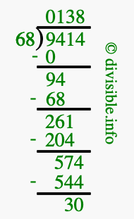 The image displays 138 at the top, which is the quotient, and 30 at the bottom, which is the remainder. Therefore, the answer to 9414 divided by 68 (9414 ÷ 68) using long division is 138 remainder 30, or simply 138 R 30.