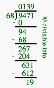 The image displays 139 at the top, which is the quotient, and 19 at the bottom, which is the remainder. Therefore, the answer to 9471 divided by 68 (9471 ÷ 68) using long division is 139 remainder 19, or simply 139 R 19.