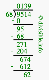 The image displays 139 at the top, which is the quotient, and 62 at the bottom, which is the remainder. Therefore, the answer to 9514 divided by 68 (9514 ÷ 68) using long division is 139 remainder 62, or simply 139 R 62.