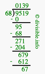The image displays 139 at the top, which is the quotient, and 67 at the bottom, which is the remainder. Therefore, the answer to 9519 divided by 68 (9519 ÷ 68) using long division is 139 remainder 67, or simply 139 R 67.