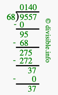 The image displays 140 at the top, which is the quotient, and 37 at the bottom, which is the remainder. Therefore, the answer to 9557 divided by 68 (9557 ÷ 68) using long division is 140 remainder 37, or simply 140 R 37.