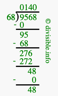 The image displays 140 at the top, which is the quotient, and 48 at the bottom, which is the remainder. Therefore, the answer to 9568 divided by 68 (9568 ÷ 68) using long division is 140 remainder 48, or simply 140 R 48.