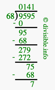 The image displays 141 at the top, which is the quotient, and 7 at the bottom, which is the remainder. Therefore, the answer to 9595 divided by 68 (9595 ÷ 68) using long division is 141 remainder 7, or simply 141 R 7.