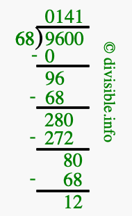 The image displays 141 at the top, which is the quotient, and 12 at the bottom, which is the remainder. Therefore, the answer to 9600 divided by 68 (9600 ÷ 68) using long division is 141 remainder 12, or simply 141 R 12.