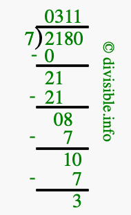 The image displays 311 at the top, which is the quotient, and 3 at the bottom, which is the remainder. Therefore, the answer to 2180 divided by 7 (2180 ÷ 7) using long division is 311 remainder 3, or simply 311 R 3.
