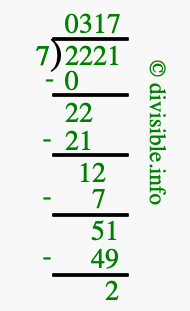 Here we will show you an image that illustrates how to calculate 2221 divided by 7 using long division. We will also give you the answer to 2221 divided by 7 (2221 ÷ 7) as a fraction and as a decimal.