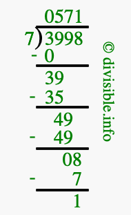 The image displays 571 at the top, which is the quotient, and 1 at the bottom, which is the remainder. Therefore, the answer to 3998 divided by 7 (3998 ÷ 7) using long division is 571 remainder 1, or simply 571 R 1.