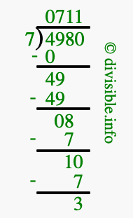 The image displays 711 at the top, which is the quotient, and 3 at the bottom, which is the remainder. Therefore, the answer to 4980 divided by 7 (4980 ÷ 7) using long division is 711 remainder 3, or simply 711 R 3.