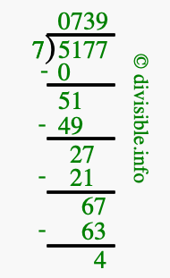 The image displays 739 at the top, which is the quotient, and 4 at the bottom, which is the remainder. Therefore, the answer to 5177 divided by 7 (5177 ÷ 7) using long division is 739 remainder 4, or simply 739 R 4.