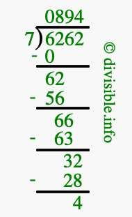 The image displays 894 at the top, which is the quotient, and 4 at the bottom, which is the remainder. Therefore, the answer to 6262 divided by 7 (6262 ÷ 7) using long division is 894 remainder 4, or simply 894 R 4.