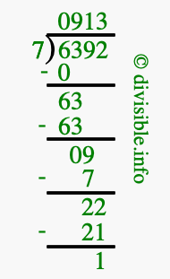The image displays 913 at the top, which is the quotient, and 1 at the bottom, which is the remainder. Therefore, the answer to 6392 divided by 7 (6392 ÷ 7) using long division is 913 remainder 1, or simply 913 R 1.