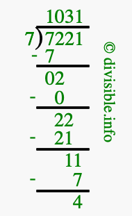 Here we will show you an image that illustrates how to calculate 7221 divided by 7 using long division. We will also give you the answer to 7221 divided by 7 (7221 ÷ 7) as a fraction and as a decimal.