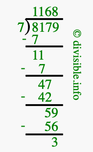 The image displays 1168 at the top, which is the quotient, and 3 at the bottom, which is the remainder. Therefore, the answer to 8179 divided by 7 (8179 ÷ 7) using long division is 1168 remainder 3, or simply 1168 R 3.