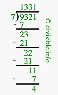 The image displays 1331 at the top, which is the quotient, and 4 at the bottom, which is the remainder. Therefore, the answer to 9321 divided by 7 (9321 ÷ 7) using long division is 1331 remainder 4, or simply 1331 R 4.