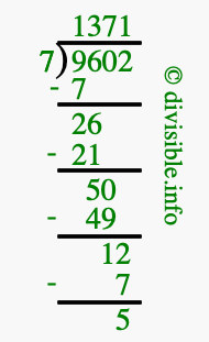 The image displays 1371 at the top, which is the quotient, and 5 at the bottom, which is the remainder. Therefore, the answer to 9602 divided by 7 (9602 ÷ 7) using long division is 1371 remainder 5, or simply 1371 R 5.