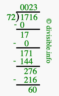The image displays 23 at the top, which is the quotient, and 60 at the bottom, which is the remainder. Therefore, the answer to 1716 divided by 72 (1716 ÷ 72) using long division is 23 remainder 60, or simply 23 R 60.