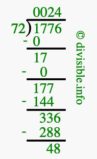 The image displays 24 at the top, which is the quotient, and 48 at the bottom, which is the remainder. Therefore, the answer to 1776 divided by 72 (1776 ÷ 72) using long division is 24 remainder 48, or simply 24 R 48.