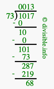 The image displays 13 at the top, which is the quotient, and 68 at the bottom, which is the remainder. Therefore, the answer to 1017 divided by 73 (1017 ÷ 73) using long division is 13 remainder 68, or simply 13 R 68.