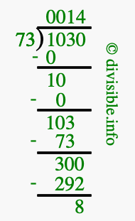 The illustration below shows you how to calculate 1030 divided by 73 using long division. As you can see, the dividend value of 1030 is located to the right of the "⟌" and the divisor value of 73 is located to the left of the "⟌".