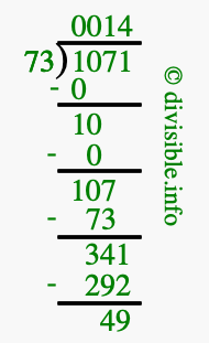 The image displays 14 at the top, which is the quotient, and 49 at the bottom, which is the remainder. Therefore, the answer to 1071 divided by 73 (1071 ÷ 73) using long division is 14 remainder 49, or simply 14 R 49.