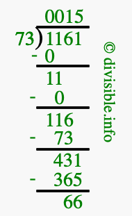 The image displays 15 at the top, which is the quotient, and 66 at the bottom, which is the remainder. Therefore, the answer to 1161 divided by 73 (1161 ÷ 73) using long division is 15 remainder 66, or simply 15 R 66.