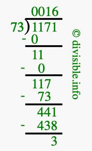 The image displays 16 at the top, which is the quotient, and 3 at the bottom, which is the remainder. Therefore, the answer to 1171 divided by 73 (1171 ÷ 73) using long division is 16 remainder 3, or simply 16 R 3.