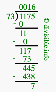 The image displays 16 at the top, which is the quotient, and 7 at the bottom, which is the remainder. Therefore, the answer to 1175 divided by 73 (1175 ÷ 73) using long division is 16 remainder 7, or simply 16 R 7.
