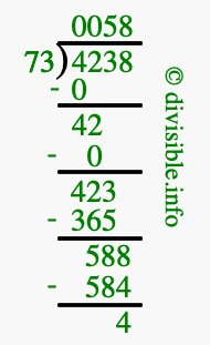 The image displays 58 at the top, which is the quotient, and 4 at the bottom, which is the remainder. Therefore, the answer to 4238 divided by 73 (4238 ÷ 73) using long division is 58 remainder 4, or simply 58 R 4.