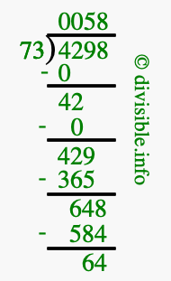 The image displays 58 at the top, which is the quotient, and 64 at the bottom, which is the remainder. Therefore, the answer to 4298 divided by 73 (4298 ÷ 73) using long division is 58 remainder 64, or simply 58 R 64.