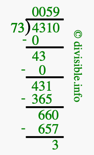 The image displays 59 at the top, which is the quotient, and 3 at the bottom, which is the remainder. Therefore, the answer to 4310 divided by 73 (4310 ÷ 73) using long division is 59 remainder 3, or simply 59 R 3.