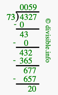 The image displays 59 at the top, which is the quotient, and 20 at the bottom, which is the remainder. Therefore, the answer to 4327 divided by 73 (4327 ÷ 73) using long division is 59 remainder 20, or simply 59 R 20.