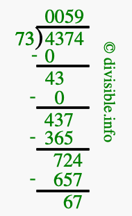 The image displays 59 at the top, which is the quotient, and 67 at the bottom, which is the remainder. Therefore, the answer to 4374 divided by 73 (4374 ÷ 73) using long division is 59 remainder 67, or simply 59 R 67.