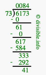 The image displays 84 at the top, which is the quotient, and 41 at the bottom, which is the remainder. Therefore, the answer to 6173 divided by 73 (6173 ÷ 73) using long division is 84 remainder 41, or simply 84 R 41.