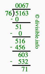 The image displays 67 at the top, which is the quotient, and 71 at the bottom, which is the remainder. Therefore, the answer to 5163 divided by 76 (5163 ÷ 76) using long division is 67 remainder 71, or simply 67 R 71.