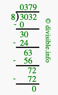 The image displays 379 at the top, which is the quotient, and 0 at the bottom, which is the remainder. Therefore, the answer to 3032 divided by 8 (3032 ÷ 8) using long division is 379 remainder 0, or simply 379 R 0.