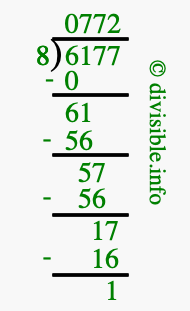 The image displays 772 at the top, which is the quotient, and 1 at the bottom, which is the remainder. Therefore, the answer to 6177 divided by 8 (6177 ÷ 8) using long division is 772 remainder 1, or simply 772 R 1.