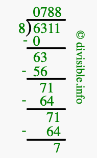 The image displays 788 at the top, which is the quotient, and 7 at the bottom, which is the remainder. Therefore, the answer to 6311 divided by 8 (6311 ÷ 8) using long division is 788 remainder 7, or simply 788 R 7.