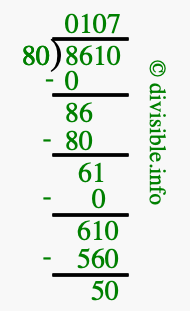 Here we will show you an image that illustrates how to calculate 8610 divided by 80 using long division. We will also give you the answer to 8610 divided by 80 (8610 ÷ 80) as a fraction and as a decimal.