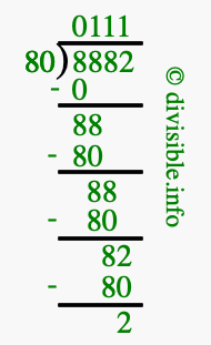 The image displays 111 at the top, which is the quotient, and 2 at the bottom, which is the remainder. Therefore, the answer to 8882 divided by 80 (8882 ÷ 80) using long division is 111 remainder 2, or simply 111 R 2.