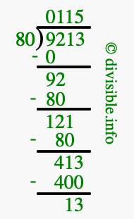 Here we will show you an image that illustrates how to calculate 9213 divided by 80 using long division. We will also give you the answer to 9213 divided by 80 (9213 ÷ 80) as a fraction and as a decimal.