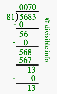The image displays 70 at the top, which is the quotient, and 13 at the bottom, which is the remainder. Therefore, the answer to 5683 divided by 81 (5683 ÷ 81) using long division is 70 remainder 13, or simply 70 R 13.
