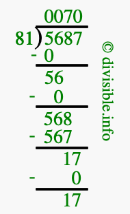 The image displays 70 at the top, which is the quotient, and 17 at the bottom, which is the remainder. Therefore, the answer to 5687 divided by 81 (5687 ÷ 81) using long division is 70 remainder 17, or simply 70 R 17.