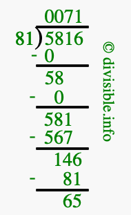 The image displays 71 at the top, which is the quotient, and 65 at the bottom, which is the remainder. Therefore, the answer to 5816 divided by 81 (5816 ÷ 81) using long division is 71 remainder 65, or simply 71 R 65.