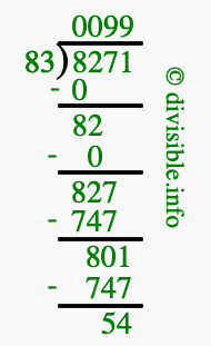 The image displays 99 at the top, which is the quotient, and 54 at the bottom, which is the remainder. Therefore, the answer to 8271 divided by 83 (8271 ÷ 83) using long division is 99 remainder 54, or simply 99 R 54.
