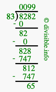 The image displays 99 at the top, which is the quotient, and 65 at the bottom, which is the remainder. Therefore, the answer to 8282 divided by 83 (8282 ÷ 83) using long division is 99 remainder 65, or simply 99 R 65.