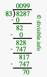 The image displays 99 at the top, which is the quotient, and 70 at the bottom, which is the remainder. Therefore, the answer to 8287 divided by 83 (8287 ÷ 83) using long division is 99 remainder 70, or simply 99 R 70.