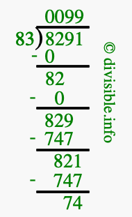 The image displays 99 at the top, which is the quotient, and 74 at the bottom, which is the remainder. Therefore, the answer to 8291 divided by 83 (8291 ÷ 83) using long division is 99 remainder 74, or simply 99 R 74.