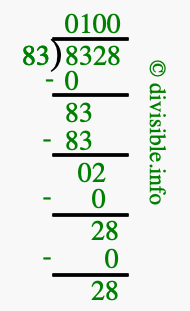 The image displays 100 at the top, which is the quotient, and 28 at the bottom, which is the remainder. Therefore, the answer to 8328 divided by 83 (8328 ÷ 83) using long division is 100 remainder 28, or simply 100 R 28.
