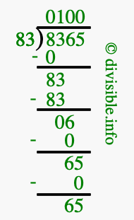 The image displays 100 at the top, which is the quotient, and 65 at the bottom, which is the remainder. Therefore, the answer to 8365 divided by 83 (8365 ÷ 83) using long division is 100 remainder 65, or simply 100 R 65.