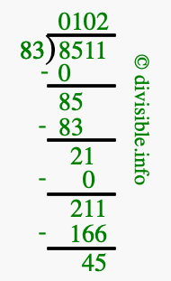 The image displays 102 at the top, which is the quotient, and 45 at the bottom, which is the remainder. Therefore, the answer to 8511 divided by 83 (8511 ÷ 83) using long division is 102 remainder 45, or simply 102 R 45.